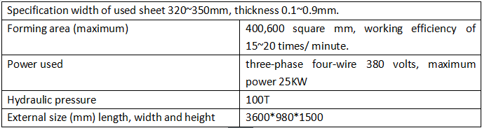 المعلمة التقنية لآلة صنع صينية الحضانة مواصفات عرض الورقة المستخدمة: 300 ~ 320 مم، السمك: 0.8 ~ 2 مم. مساحة التشكيل (الحد الأقصى): 400*600 مم، كفاءة العمل 15 ~ 20 مرة / دقيقة. الطاقة المستخدمة: ثلاث مراحل وأربعة أسلاك 380 فولت، الطاقة القصوى 25 كيلو وات الضغط الهيدروليكي: 100 طن الحجم الخارجي (مم) الطول والعرض والارتفاع) 3600 مم * 980 مم * 1500 مم